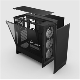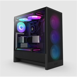 Overview The H5 Flow RGB boosts airflow and GPU cooling with its perforated PSU shroud, mesh panels, and large radiator support-all in a compact mid-tower form factor. The PSU shroud is perforated on the side and bottom, enabling optimal air intake from two 120mm fans (not included). Supports up to a 360mm radiator in front and a 240mm radiator up top for powerful liquid cooling potential. Ultra-fine mesh on the top, front, and side panels creates maximum airflow and filters dust. Equipped with a front-mounted F360 RGB Core (CV) single-frame fan and rear-mounted F120Q (CV) fan for strong out-of-the-box cooling and lighting. Effortlessly route and conceal cables using the wide channels, hooks, and straps. H5 Flow RGB Compact ATX mid-tower chassis with high airflow, optimal GPU cooling, and large radiator support. More Air to the GPU Mesh PSU shroud maximizes air intake from two 120mm bottom-mounted fans (not included). Fits Large Radiators Supports a 360mm radiator in front and a 240mm radiator up top for powerful liquid cooling setups. |