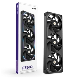 F360X 360 mm Performance RGB Single-Frame Fan The NZXT Performance Fans deliver powerful, quiet cooling with LCP construction, optimized blades, and a hybrid bearing system for superior airflow and durability. A reinforced core, advanced motor, and subtle RGB lighting combine performance and style for any gaming PC. • LCP Construction: Liquid-crystal polymer blades and frame maintain their shape at high speeds, resisting flex and vibration for more powerful, consistent cooling. • Optimized Blade Design: Ultra-tight tip-to-frame clearance reduces turbulence and air leakage, maximizing airflow and static pressure at every speed. • Custom Hybrid Bearing: Magnetic levitation keeps the rotor centered and stable at high speeds, while fluid dynamic lubrication reduces friction and wear for smooth, durable, and quiet operation. • Reinforced Core: A metal enclosure reinforces the motor housing, improving structural stability for reliable performance at high speeds. • Advanced Motor: 3-phase, 6-pole design delivers smoother, more precise speed control for steady, efficient cooling with less noise. • Refined Design: Brushed aluminum accents and subtle RGB lighting create a clean, modern look that complements any setup. • Multi-Fan, Single-Frame: All-in-one frame design reduces screws and cables for simpler installation and a cleaner-looking build. • Digital Control: Fine-tune fan speeds and RGB lighting effects through NZXT CAM* or motherboard software. *Requires NZXT Control Hub or NZXT motherboard required, sold separately. |