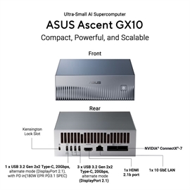 Choose Your ASUS Ascent GX10 • Extreme AI Performance: Powered by NVIDIA® GB10 Grace Blackwell Superchip delivering 1 petaFLOP of AI performance and 128GB memory for 200B model fine-tuning. • Developer-Optimized Platform: Tailored for AI researchers and developers with full-stack compatibility and streamlined workflows. • Scalable Architecture: Featuring NVIDIA® NVLink™-C2C for ultra-fast CPU-GPU memory communication and NVIDIA® ConnectX-7 networking to support dual GX10 system stacking, unlocking superior scalability and performance. • Advanced Thermal Design: Engineered cooling ensures sustained high performance and reliability in an ultra small form factor. • Minimal Footprint, Maximum Efficiency: High-density compute power in a compact system designed for labs, offices, and edge environments. • Full Stack AI Solution: The GB10 and NVIDIA AI software stack provide a full stack solution for AI development and deployment. • Secure & Scalable Agentic AI with NVIDIA NemoClaw: ASUS Ascent GX10 with NVIDIA NemoClaw enable safe, local, and scalable autonomous agents’ |