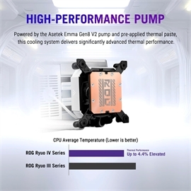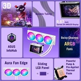 ROG Ryuo IV 360 ARGB White Edition · Movable curved 6.67-inch AMOLED display supports 3D-effect video or customized system information · Asetek Emma Gen8 V2 pump and pre-applied thermal paste deliver significantly advanced thermal performance, ensuring CPUs operate at optimal temperatures even under sustained and heavy workloads · Precision Mount System applies uniform contact pressure on the CPU, enhancing cooling performance and long-term reliability · The pre-installed, daisy-chained fans deliver strong, stable airflow to enhance overall cooling performance, while reducing the installation process from six cables to just one · Intuitive customized software supports hardware monitoring and features screen content management tools · Pre-assembled cooler elements enable faster and easier installation · Aura Fan Edge elevates gaming builds with stylish front and side ARGB lighting · Support for Intel LGA 1851, 1700,1200, 115X and AMD AM5 and AM4 sockets Product Name: ROG RYUO IV 360 ARGB WHT Part Number: 90RC01N2-B0AAY0 |